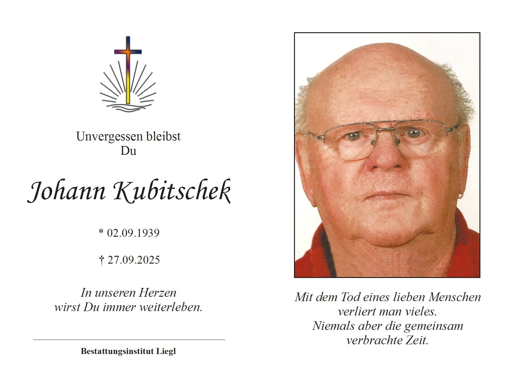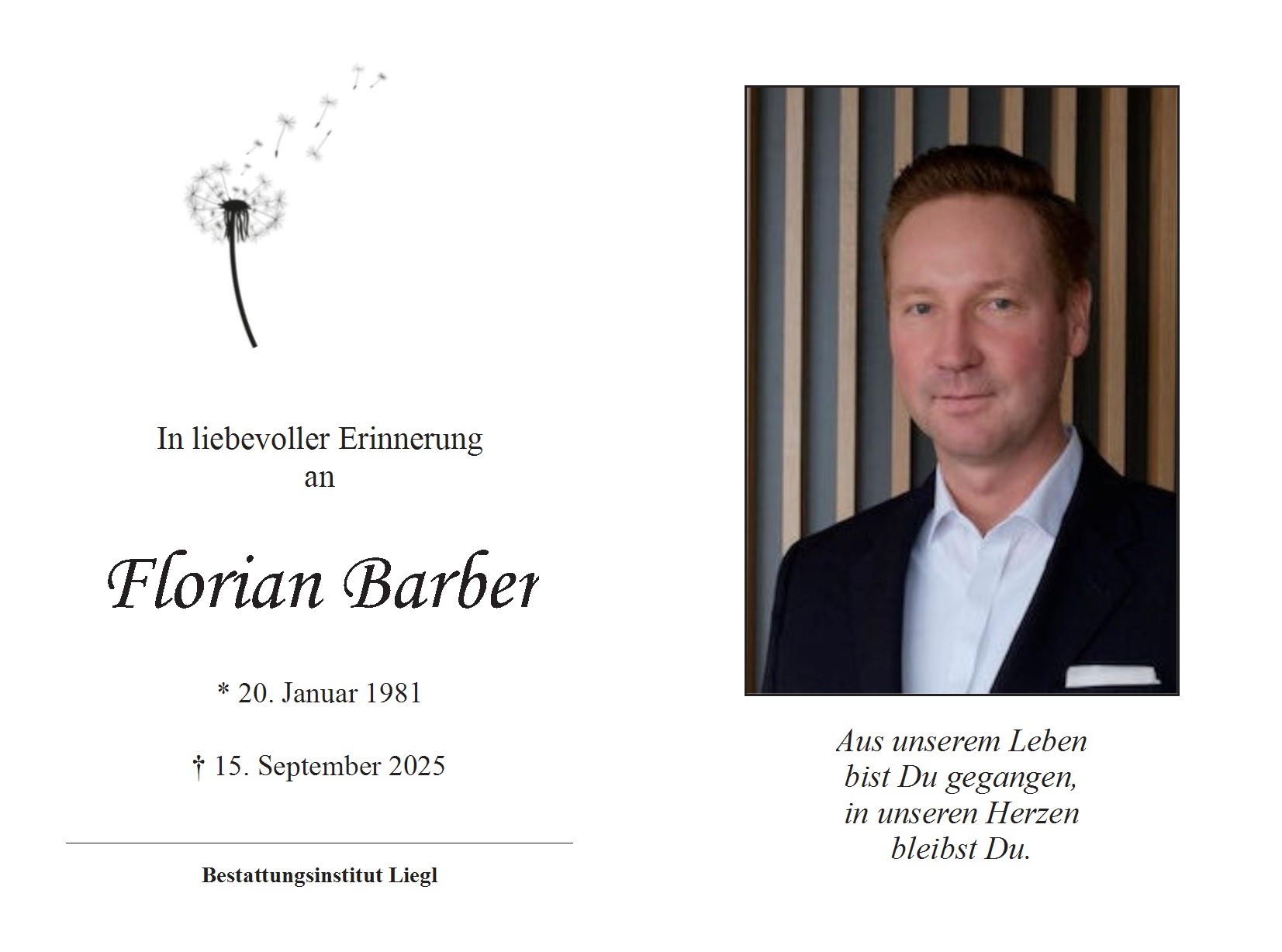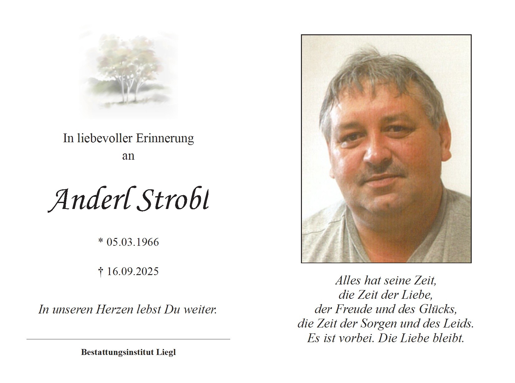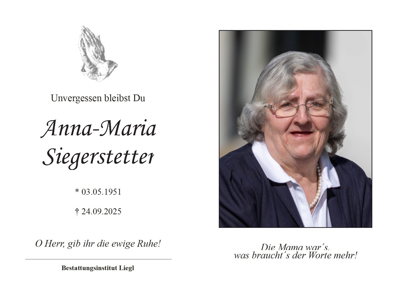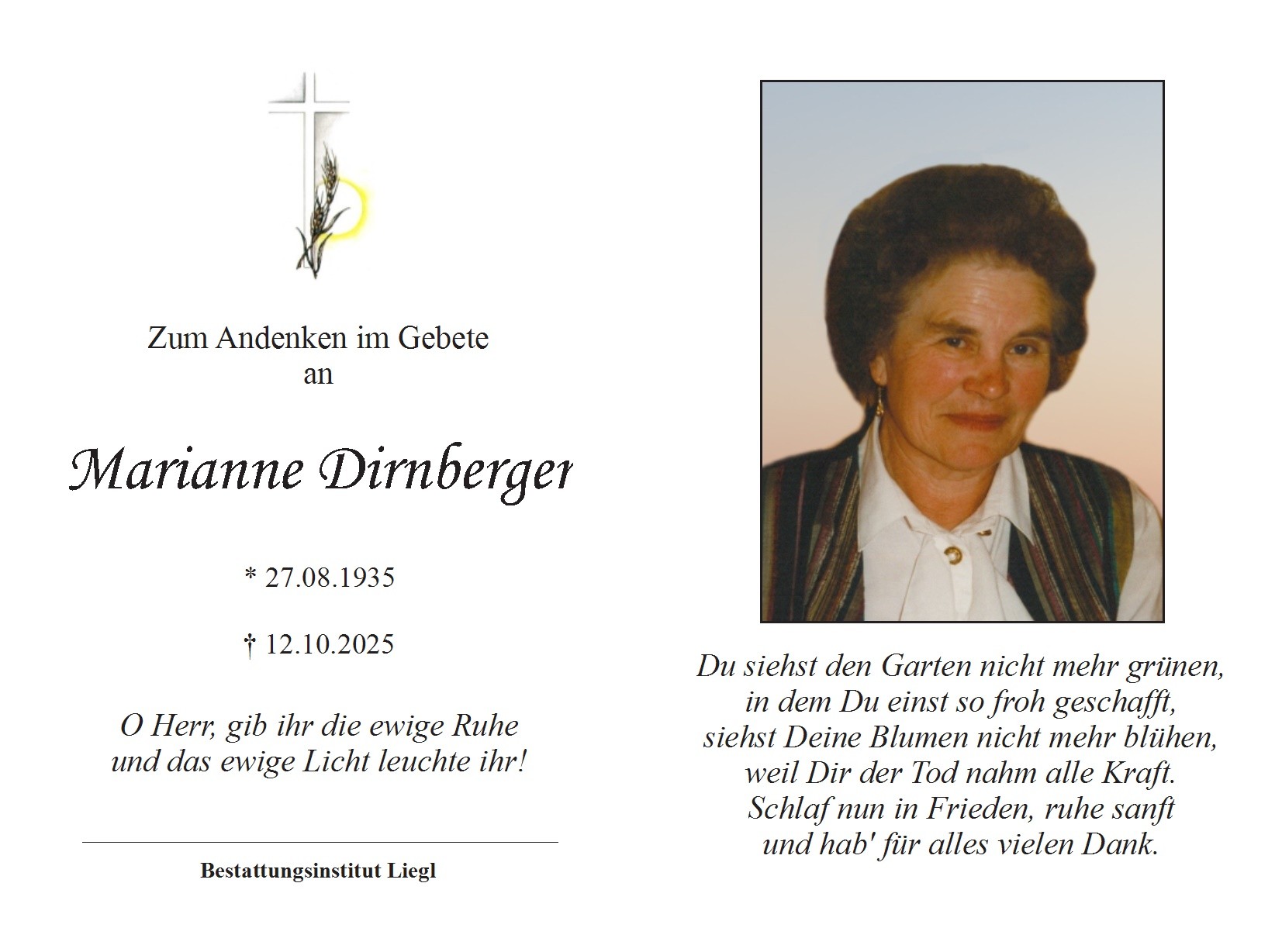 Die Trauerfeier findet am Donnerstag, den 30. Oktober 2025 um 15 Uhr in der Aussegnungshalle im Friedhof Kirchdorf am Inn statt, anschließend Urnenbeisetzung.